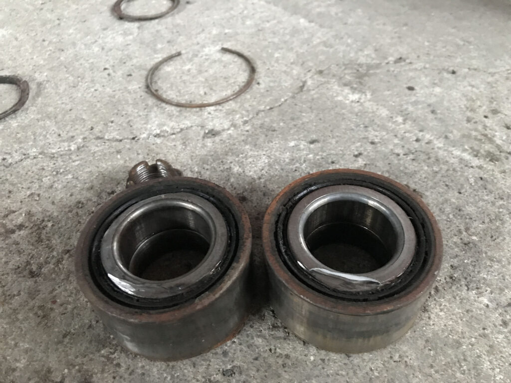 交換のため取り外された旧ハブベアリング部分です。中央の銀色部分を抜くと「ベアリング」が現れます。